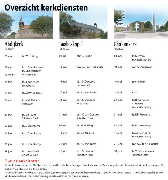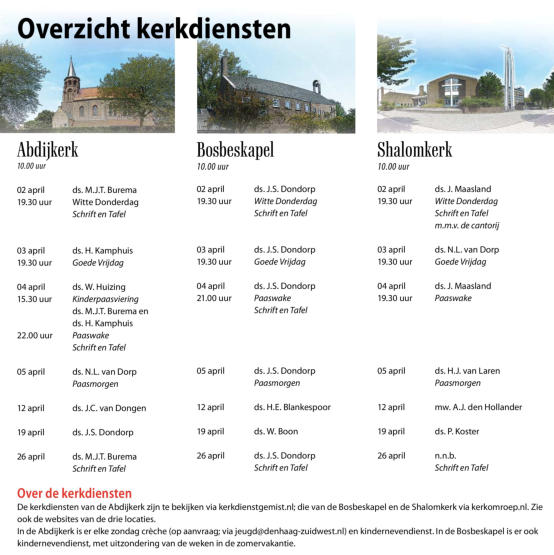 Welkom op de website van de Protestantse wijkgemeente Den Haag-Zuidwest!Deze gemeente wordt gevormd door drie vierplekken (Abdijkerk, Bosbeskapel en Shalomkerk), die elk hun eigen website hebben.Op deze site vindt u alle informatie over de wijkgemeente Zuidwest in zijn geheel.
